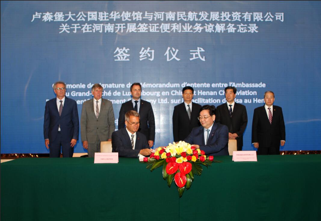 6月13日,省委書記、省人大常委會主任謝伏瞻在鄭州會見了來豫訪問的盧森堡首相格扎維埃?貝泰爾一行,并和省長陳潤兒共同見證有關合作協(xié)議的簽署。河南航投黨委書記、董事長張明超一同參加會見,并代表河南航投與盧森堡駐華大使石泰嵋簽署《關于在河南開展簽證便利業(yè)務諒解備忘錄》.