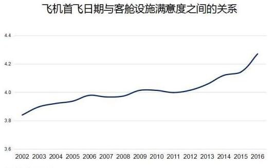 上圖是飛機首飛日期與客艙設(shè)施滿意度之間的關(guān)系,可以看出首飛日期越近滿意度越高,首飛日期越早滿意度越低,而且是持續(xù)地降低?!耙簿褪钦f我們?nèi)说男枨笤谧兓覀兊酶先说男枨笞兓?。行業(yè)的標(biāo)準(zhǔn)是持續(xù)的在升級的,我們需要往前追趕?!?