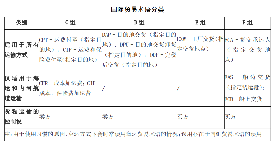 在國際貿(mào)易的貨物銷售合同中,進(jìn)出口商使用國際商會《國際貿(mào)易術(shù)語解釋通則》(Incoterms),界定買賣雙方在風(fēng)險(xiǎn)、成本、運(yùn)輸和保險(xiǎn)方面的義務(wù),避免誤解、爭議與因此導(dǎo)致的損失以及其他法律難題。根據(jù)最新的《國際貿(mào)易術(shù)語解釋通則》2020版,國際貿(mào)易術(shù)語共分成2類4組11個。
